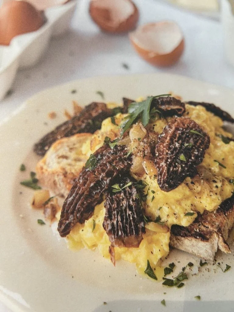 Verser les œufs brouillés par-dessus, puis répartir les morilles
